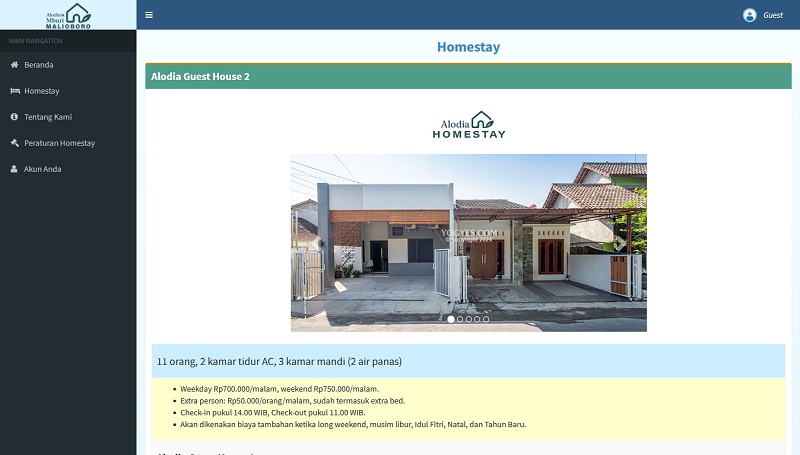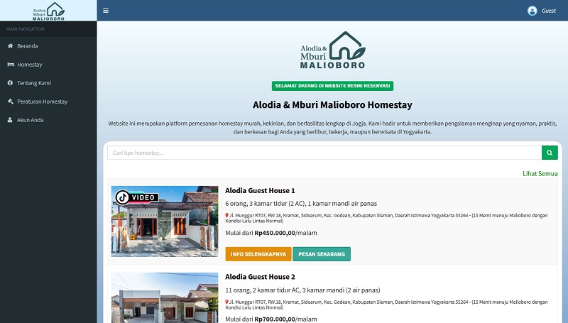 Website Alodia & Mburi Malioboro Homestay sebagai platform untuk melakukan pemesanan berbagai homestay murah, kekinian, serta dengan fasilitas komplit yang ada di sekitar Yogyakarta.